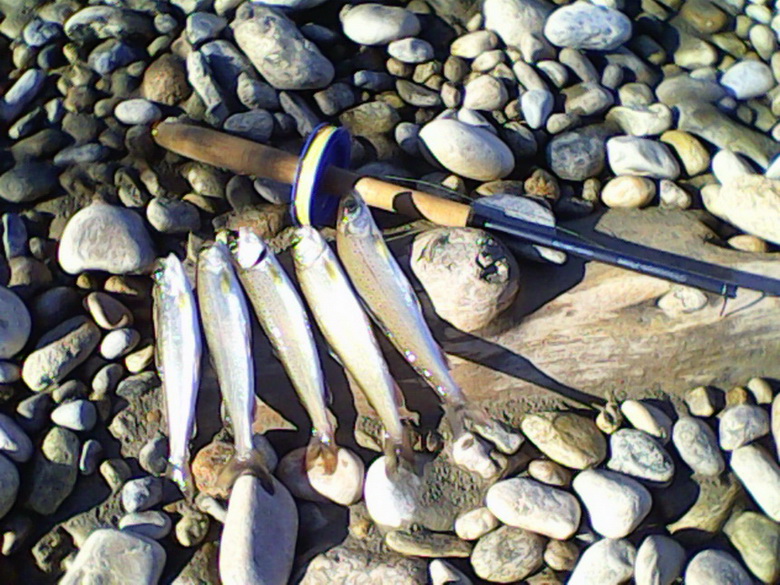 Вечером ловил в другом месте, километров на пять выше по течению. Начал ловить одной мухой. Клев был вяленький. Добавил вторую муху, сразу оживилось. Правда сказать на верхнюю уху попалось всего два монстрика, причем один всего сантиметра два, крючок 12, больше него. Вся остальная рып на нижнего кебарика. Видимо вторая муха что то вроде дополнительного раздражителя для хариуза. И опять же по проводке. Верхняя муха как бы "цепляется" за поверхность натягивая при этом левел, а нижняя на свободном подлеске играет. Вот так вот мне увиделось.