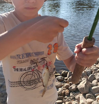 Неудачная поездка на карьер только раззадорила. Сегодня после очередного небольшого дождика взял обоих внуков и поехал за 30 км на приток Вологды. Когда доехали до места, там дождь ещё продолжался, пришлось пережидать минут 15 в машине. Вскоре выглянуло солнце, и мы спустились на довольно длинную песчаную отмель. Здесь на довольно быстром течении обычно держалась уклейка, а другой берег с нависающими кустами давал хорошие укрытия для подъязков. Рыба не подвела - не успел я подготовить младшему трёхметровый "Бриз", как старший вытащил первую уклейку, после фотосессии отправленную обратно. Фотосессия оказалась короткой - разрядился смартфон. Через некоторое время ещё одну, на этот раз крупную уклейку.У младшего всё никак не получалось вытащить рыбку, хотя поклёвки он чувствовал. Моя 4-хметровая ТП проф с шестиметровым левелом позволяла закидывать к другому берегу, и на втором или третьем забросе взял небольшой стограммовый подъязочек. Внукам это добавило энтузиазма, и теперь они старались встать и забрасывать ко мне поближе. Мне же пришлось чаще распутывать младшему оснастку. Через полчаса напротив них плеснулась более крупная рыбёшка, но их снасти дотуда не доставали. Первый же мой заброс к этим кустам принёс хватку хорошей рыбы и сход. Через несколько забросов под самые ветки - ещё одна поклёвка, рыба согнула удилище и никак не хотела выходить на поверхность. Её рывки в разные стороны на длинном левеле настолько впечатлили внуков, что старший кинулся было мне помогать, но был мною остановлен. Когда я подвёл рыбу к берегу, он снова хотел её схватить, но я ему не позволил. На этот раз подъязок был покрупнее - 300+, и отпустить его мне не дали. Под конец повезло младшему - он сумел-таки подсечь и вытащить двух мелких уклеек. В итоге каждый поймал по две рыбки.