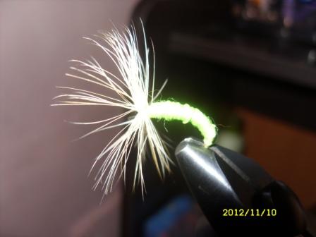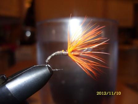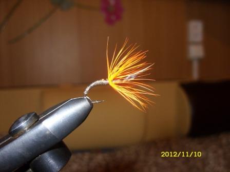 Эксперимент с оранжевым пером. Верхние с крючком Hayabusa Koaji №4 (без колечка), нижние - с Tagroy №6. Нитка тёмно коричневая. Купил в тканях чёрную нитку для потайных швов, штука хорошая, только вот проблема у меня с финишным узлом, не чайник а конкретный "самовар".