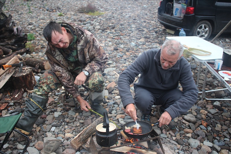 спускаемся еще на 10км ниже, ищем более менее глубокие сливы и перекаты. Солнце переваливает полдень, решаем пообедать. Опять рыбный день (хотя в Советском Союзе он был только по четвергам, почему-то)