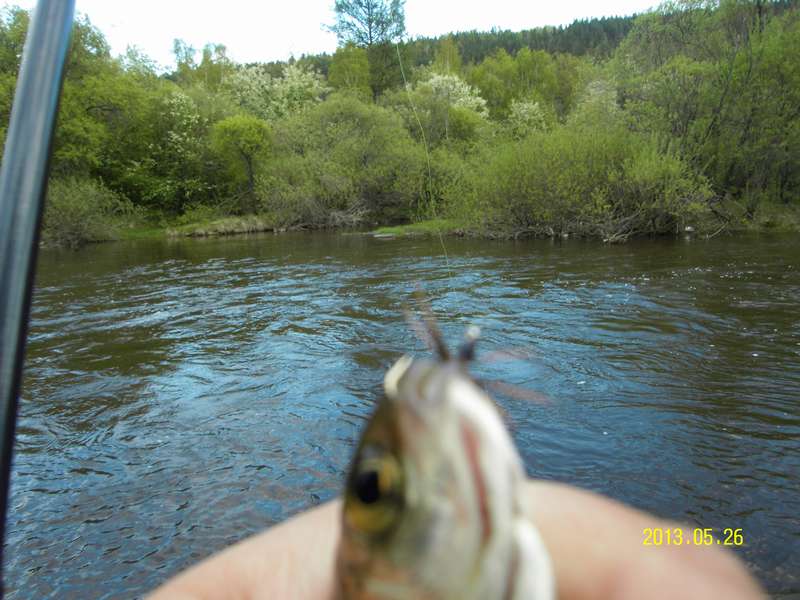 Вчера выскочил на речку недалеко от города, после обеда - на пару часов. Погода была ветреная и изменчивая - то солнце то тучки, то жарко, то прохладно. Вышел в начало плёса - дальше пройти не смог - глубоко, а по берегу пройти невозможно. Дык вот - прыгают хариуски по 10 см и гольян хватает под глубоким берегом. Был один приличный выход, но подсечка ничего не дала - промахнулся. Немного попозже сдвинулся к мелкой стороне плёса - и тут хариус выдал себя плюхом - на мелководье - ну от силы 30-40 см. Самого рыба я не увидел - только тень на дне, бросил туда кебарика и как только мушка упала на воду - мгновенный всплеск и рыб на крючке. Подсечка наверняка была, но в памяти этот момент не отложился... Вполне нормальный (по нашим меркам) хариус - но снова только один зачётный.