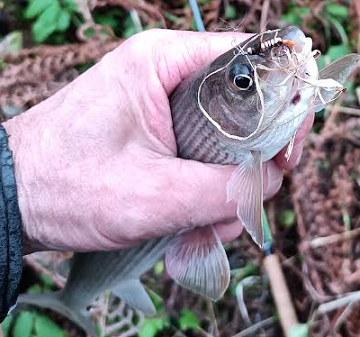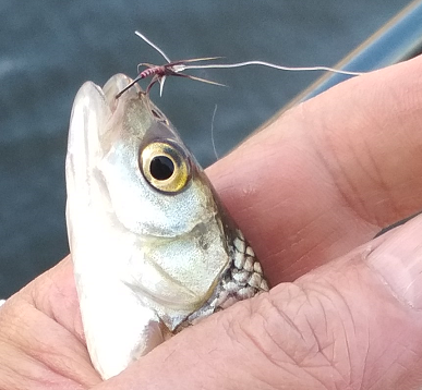 Между делом: сегодня надо было "убить" час времени, оказался поблизости от городской набережной - тенкара всегда в машине, почему бы и нет? Уклейка толклась около старой причальной стенки, атаковала кебари на каждом забросе, поймал за час десятка полтора, но была вся такая мелкая, что даже фотографировать не хотелось - сразу выкидывал обратно. Стал заглублять муху, и на одной из проводок взял голавлик. Этот заслужил фотосессию.