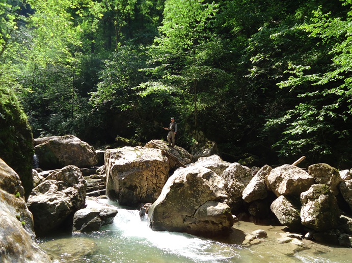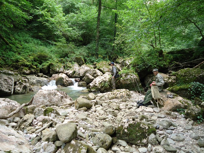 Здравствуйте уважаемые форумчание… и гости тоже! Давно уж не писал отчетов, да и поделиться особо было не чем по причине занятости и обильных дождей, которые серьезно подняли уровень рек и окрасили воду в коричневые тона. Но все когда-то кончается, а осадки тем более. Давно обещал брату совместный выезд на форель и с просветлением водички пришло время выполнять обещания. Место ловли: один из притоков Лабы, снасть: брату вручил тенкару 3,6 (надо приобщать), сам с ZOOM и маховая попловочка у племянника. Насадка у всех – кебари. С рассветом в горы большого смысла нет, поэтому выехали в шесть и в районе восьми начали подъем по руслу. Сразу скажу – за день было пройдено не много, примерно 3 км, в процессе движения поднялись на высоту примерно 79 метров от начальной точки (согласно гугла).