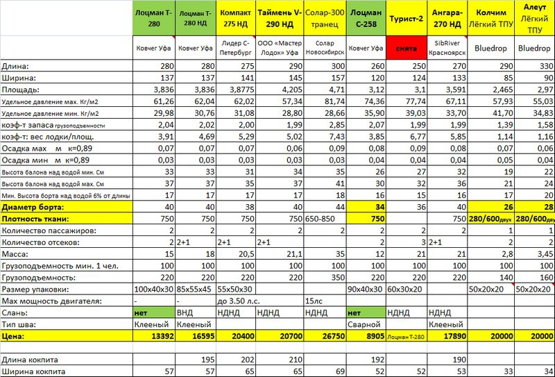 Интересно было посмотреть и сравнить лодки по следующим показателям.