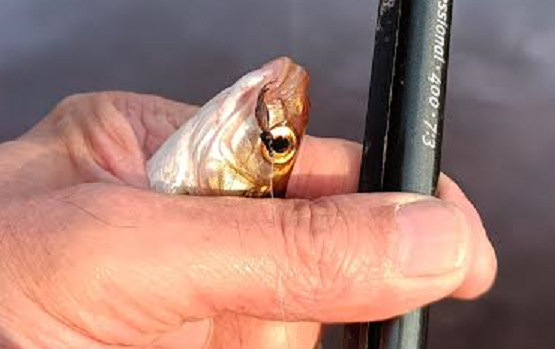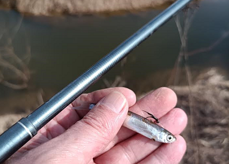Вчера второй день тепла после недавних снегопадов. 10-15 см снега, что выпал за пару недель, уже растаял. Решил вновь посмотреть уклеечный приток. Уровень низкий, вода довольно прозрачная. Та же мелочь стояла стайками в обычных местах в 10-20 см от поверхности, так же подскакивала к упавшей кебари, и так же не могла справиться с 12-м крюком. Всё-таки удалось за час зацепить 8 рыбок. Заглубление кебари на глубину принесло одну мелкую сорожку и одну уклейку чуть крупнее остальных.