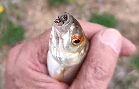 Сегодня днём проверял уклеечный приток. К устью не подъехать - идёт активное коттеджное строительство, колеи глубокие и грязные - не хотел пачкать машину. Прошёл пешком. От устья вверх метров на 300 речка на подпоре, течение обратное, с основной реки нанесло мусора, пены, старой травы, вода мутная. Переехал выше - там вода уже прозрачная, течение присутствует, но уровень ниже обычного весеннего на полтора метра, приток местами метра 2 шириной. Уклейка выдавала себя кругами в разных местах. В поляриках было хорошо видно, что по всему руслу речка буквально забита очень мелкой уклейкой. В надежде на то, что ниже может быть более взрослая, начал с нимфы, заглубляя её до метра - никакой реакции. Поставил лёгкого кебарика на 14-м крюке - начались атаки, но подсечь никак не получалось. Наконец удалось вытащить одну - сантиметров семь ростом. Поменял несколько мест, везде одна картина - мелочь толпой бросается на мушку, дёргает её за кончики пера, и никак не может зацепиться. в итоге всё-таки одна забагрилась за спинку, заснял её, чтобы представляли, почему такую почти невозможно нормально подсечь. Снимал и видео, но показать, увы, нечего.