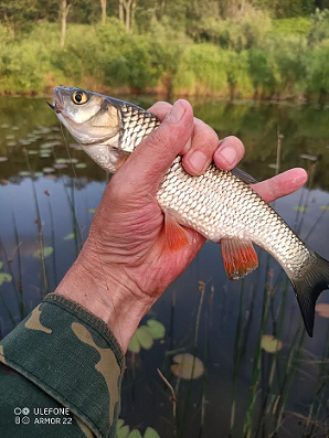 Затем ещё одного такого же. Сменил место, благо знаю по прошлым рыбалкам, где могли быть покрупнее, и не ошибся - попались пара вот таких голавликов, и один такой же сошёл, сделав сразу после подсечки эффектное сальто.